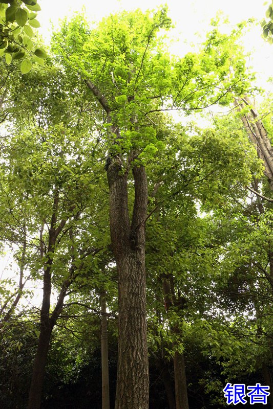 银杏:叶扇形、柄长;叶开裂,秋天满树金黄;树干浅灰至灰褐色;白果有抗癌功效,植物活化石